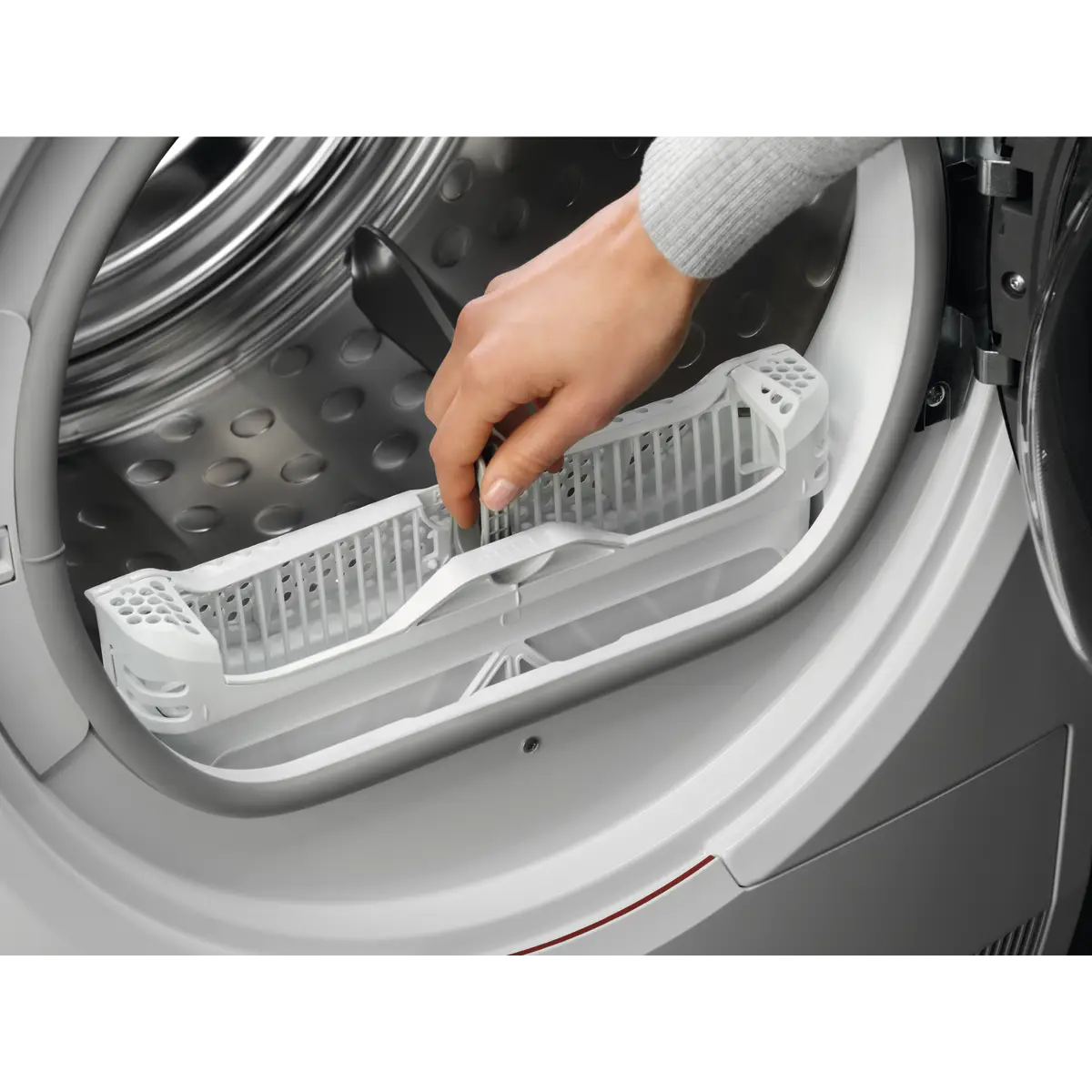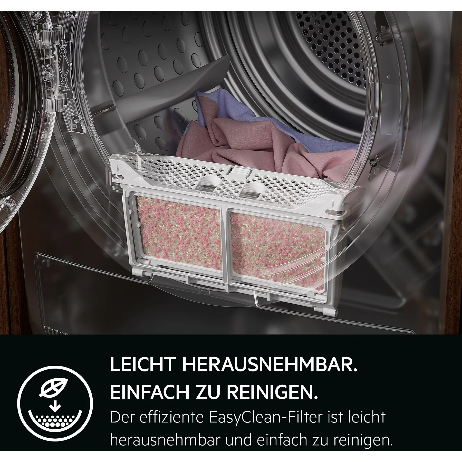 Il filtro EasyClean semplifica la pulizia dell’asciugatrice. Può essere rimosso con un solo movimento, aperto come un libro e pulito. Rimuovi i pelucchi dal filtro per risultati di asciugatura ottimali.
