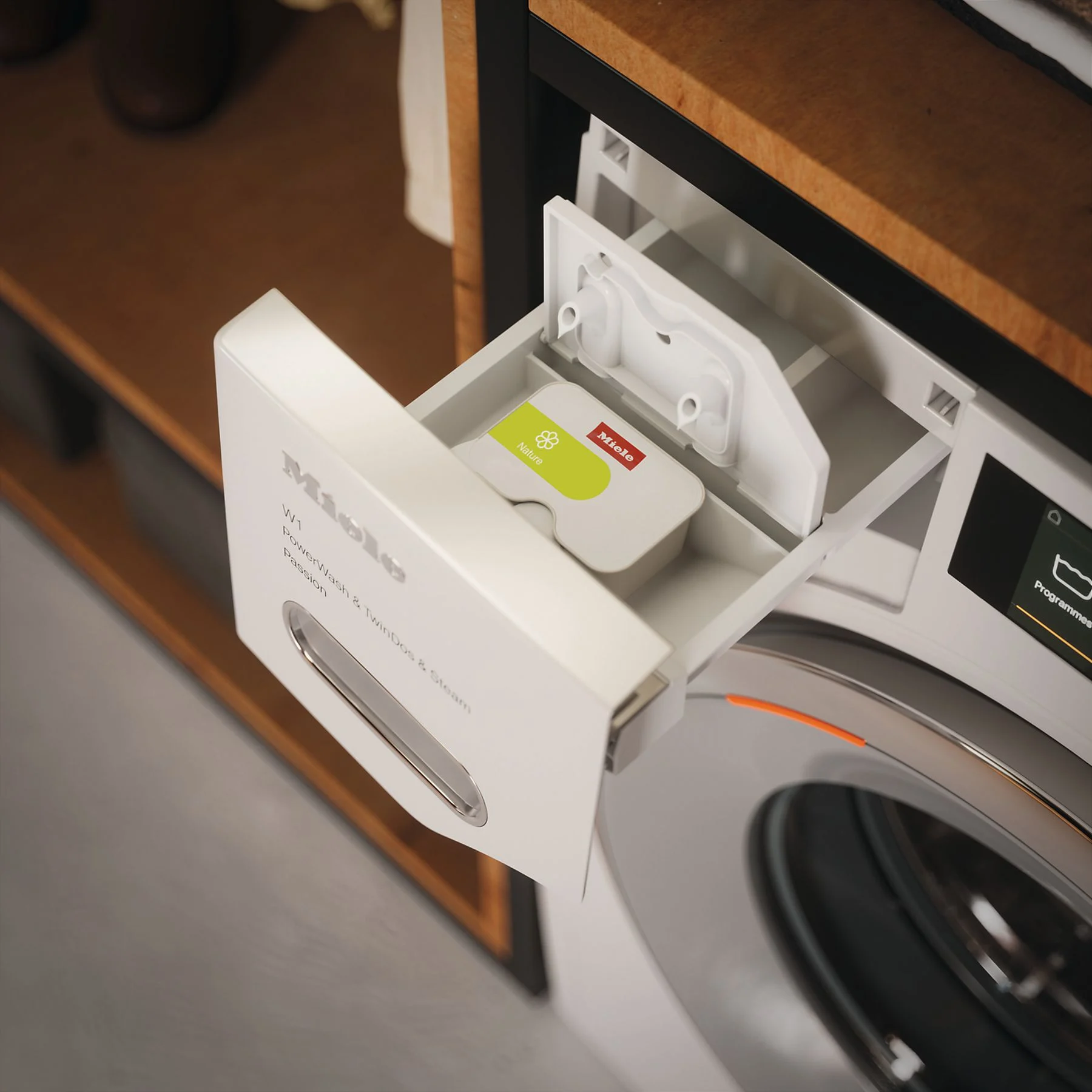 | Caratteristiche speciali | Design della porta in nero ossidiana con anello bianco, CapDosing con dosaggio controllato, distributore di detersivo AutoClean, funzione di ricarica AddLoad, contatore dell'acqua e motore ProfiEco |